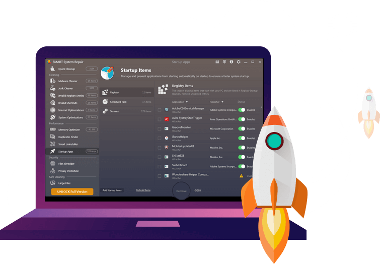 Many programs are designed to start automatically when Windows starts. The programs you rarely or never use wastes precious memory and slows down the time it takes Windows to finish starting up. SMART System Repair helps Limit how many programs run at startup. Decide for yourself if you want a program to run at startup using the inbuilt Startup Manager.